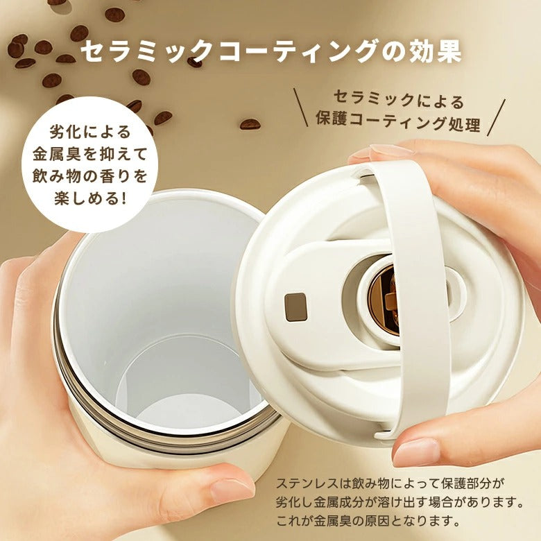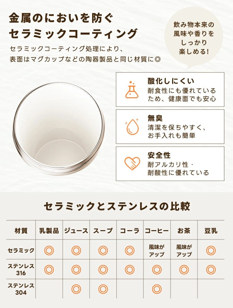 はい。内側はセラミックコーティングされているため、ステンレス特有の金属臭が一切ありません。コーヒーや紅茶、炭酸水など、本来の香りと味をそのまま楽しめます。