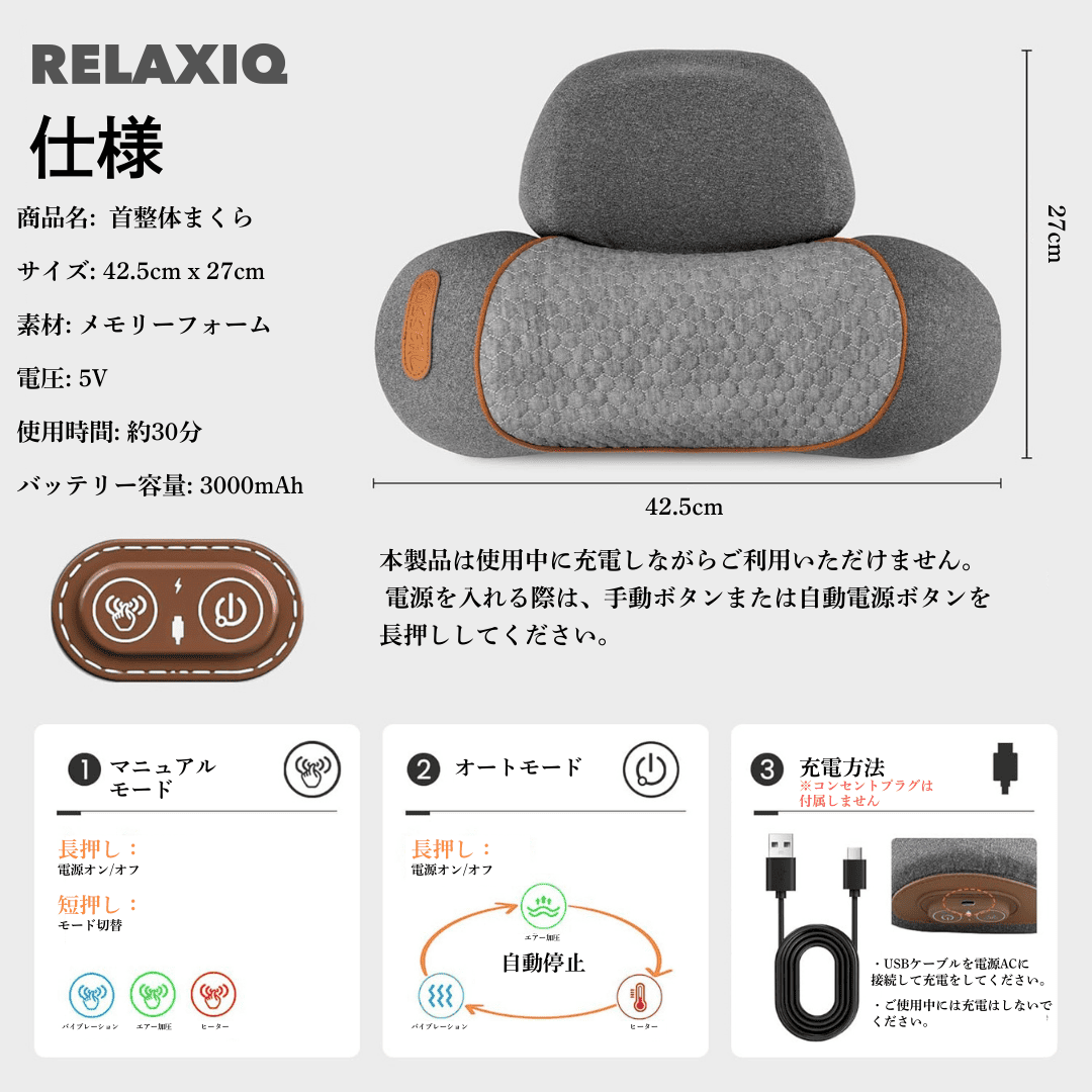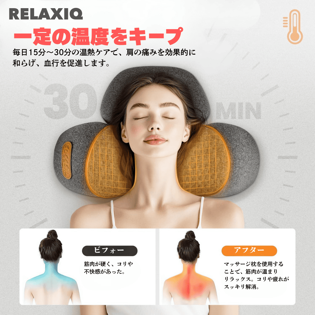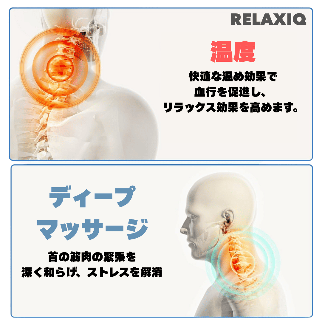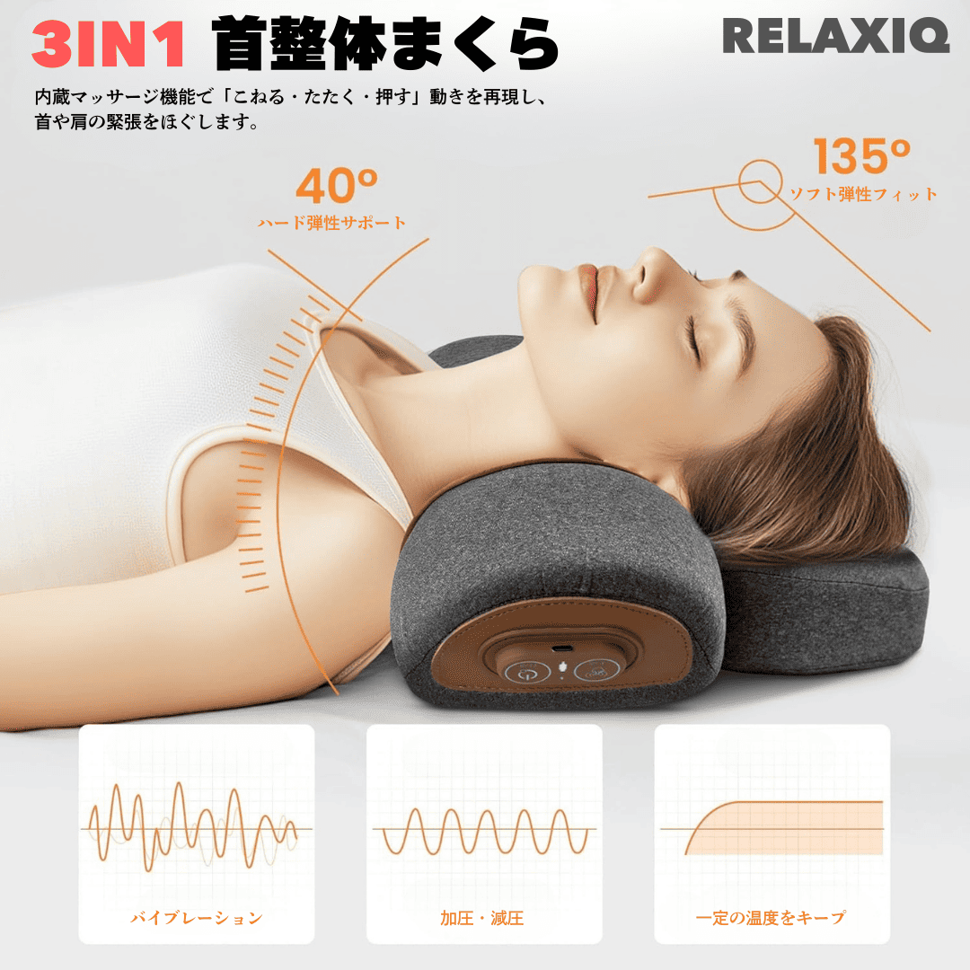 RELAXIQ-首整体まくらは、一定温度の加熱と振動マッサージを組み合わせることで、首や肩の緊張や不快感を効果的に和らげます。